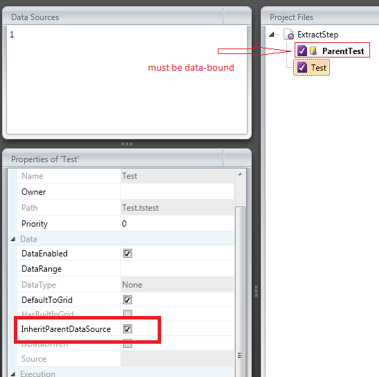 I also want to share with you another ability of Test Studio that you might not be aware of, and this is the ability to inherit the data source from the parent data-bound test by checking the "InheritParentDataSource" property in the test properties(see screenshot). Note that the test should be used as a sub test of a data-driven test to be able to inherit it's data info or Test Studio will fire an error.