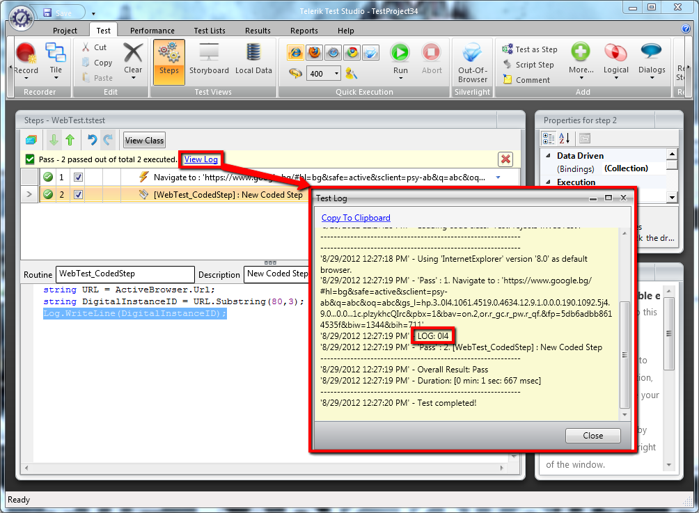 This line will write it the the Log and you can review it after the test run (screenshot 1).