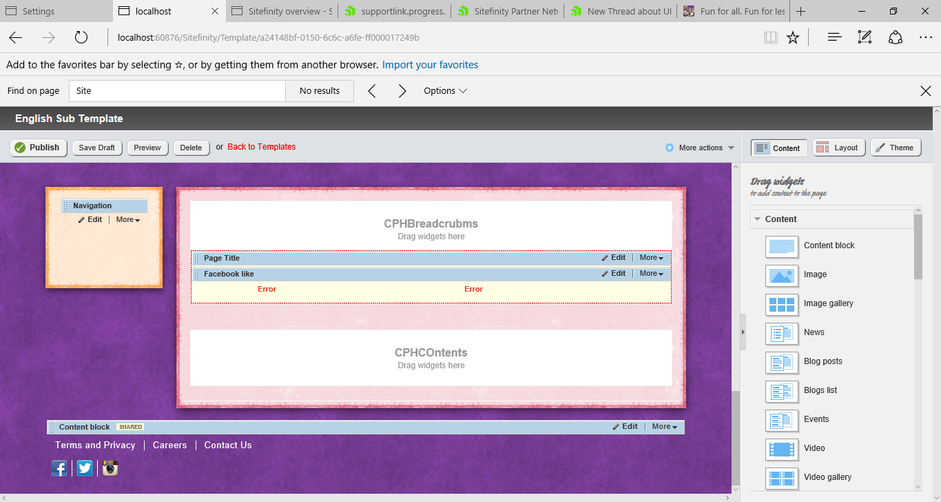 Hi, I am new to Sitefinty , and I have inserted "Facebook Like Widget" but I noticed that this is generating an error in the template , and I am trying to click on it on the page and the counter is showing zero . and nothing happened . the website is still running on my local . please advise.