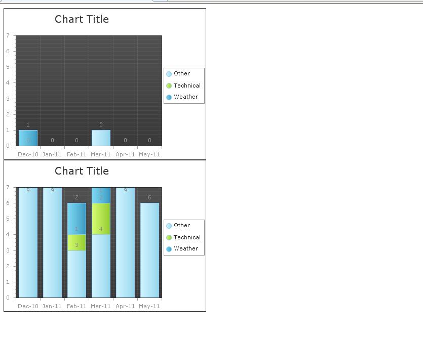 chart.PlotArea.XAxis.DataLabelsColumn = "MonthYear"; chart.PlotArea.XAxis.Appearance.ValueFormat = Telerik.Charting.Styles.ChartValueFormat.ShortDate; chart.PlotArea.XAxis.Appearance.CustomFormat = "MMM-yy"; chart.PlotArea.XAxis.AutoScale = false; chart.PlotArea.YAxis.AutoScale = false; chart.ChartTitle.Visible = true; chart.ChartTitle.TextBlock.Appearance.Visible = true; chart.ChartTitle.Appearance.Position.AlignedPosition = Telerik.Charting.Styles.AlignedPositions.TopLeft; if (chart.ID == "radChart") { chart.PlotArea.YAxis.AutoScale = true; chart.DataManager.ValuesYColumns = new string[] { "Discretion" }; //chart.PlotArea.YAxis.MinValue = start; //chart.PlotArea.YAxis.MaxValue = end; //chart.PlotArea.YAxis.LabelStep = diff; if (strCrewType == "FD") chart.ChartTitle.TextBlock.Text = "Incidents of Flight Deck Operating into Discretion"; else chart.ChartTitle.TextBlock.Text = "Incidents of Crew Operating into Discretion"; } else { chart.PlotArea.YAxis.AutoScale = false; //chart.PlotArea.YAxis.MinValue = start; //chart.PlotArea.YAxis.MaxValue = end; chart.PlotArea.YAxis.LabelStep = diff; chart.DataManager.ValuesYColumns = new string[] { "Dispensations" }; chart.ChartTitle.TextBlock.Text = "QCAA Dispensations"; } chart.DefaultType = Telerik.Charting.ChartSeriesType.StackedBar; chart.DataGroupColumn = "Type"; var obj = (from c in listCrewMetricsOut where c.CrewType == strCrewType select c); chart.DataSource = obj; chart.DataBind();