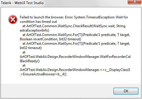 I have problem with launching browser on Windows 7 and Visual Studio 2010. I have installed WebUi Developer Edition on my machine, but when I started recording always appears error message "Failed to launch the browser". I think that settings in IE 8 is not problem, because I made all necessary settings for IE8. Please see attached file.