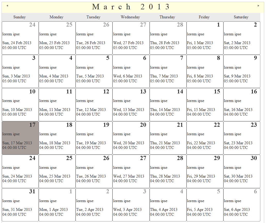 Let me say up front I do understand that using the Calendar as a wall-calendar in full-screen mode is unsupported at this time, but I am looking to the future, because it is a very useful data-driven wall-calendar widget. The data-value custom attribute makes it easy to bind the calendar cells to a hashed object whose keys take the form "2013/0/12", i.e. year/javascript month ordinal/day of month.