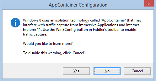 This morning I installed Fiddler 2 on my Vaio laptop, which has Windows 8.1 Professional installed on it. After installing it and running it for the first time I got a popup message (please see attached) that said that Windows 8.x uses something called "AppContainer" to restrict network traffic. I went to the help and it seemed to me that if I did click on the Win8Config button in Fiddler2, it would make the necessary changes, but it would also ask me which other apps I would want to open up for the same sort of network traffic. At this point I became hesitate. First, I don't completely understand the risks involved. Secondly, I do want to make it possible for Fiddler to access the network traffic it needs; I've found Fiddler to be very useful in trying to determine what's going on when things go wrong with my web applications. However I don't know which applications I would want to list in the exceptions list, and I don't know what impact it would have. I want the protection I need, but also be able to develop ASP.NET MVC and Web Forms apps, WPF, WCF and Web API, Windows Phone as well as Windows 8.x apps. I'd appreciate some direction on this, please.