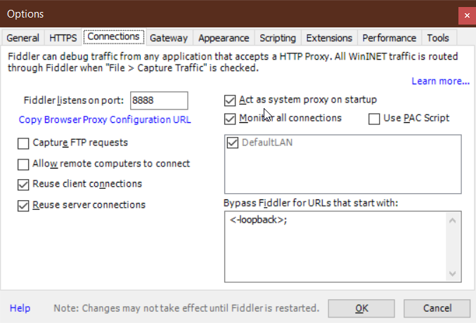 3. Screenshot of the Fiddler Connections Tab in settings? To find this go to Tools -> Options -> Connections