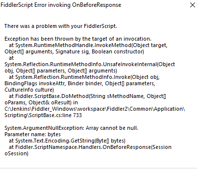 Hello, I am trying to use FiddlerScript to change a json response from my API server to my client. I keep on getting an error when I have my client connect to the server. I am new to FiddlerScript so I don't know if I am doing anything wrong.