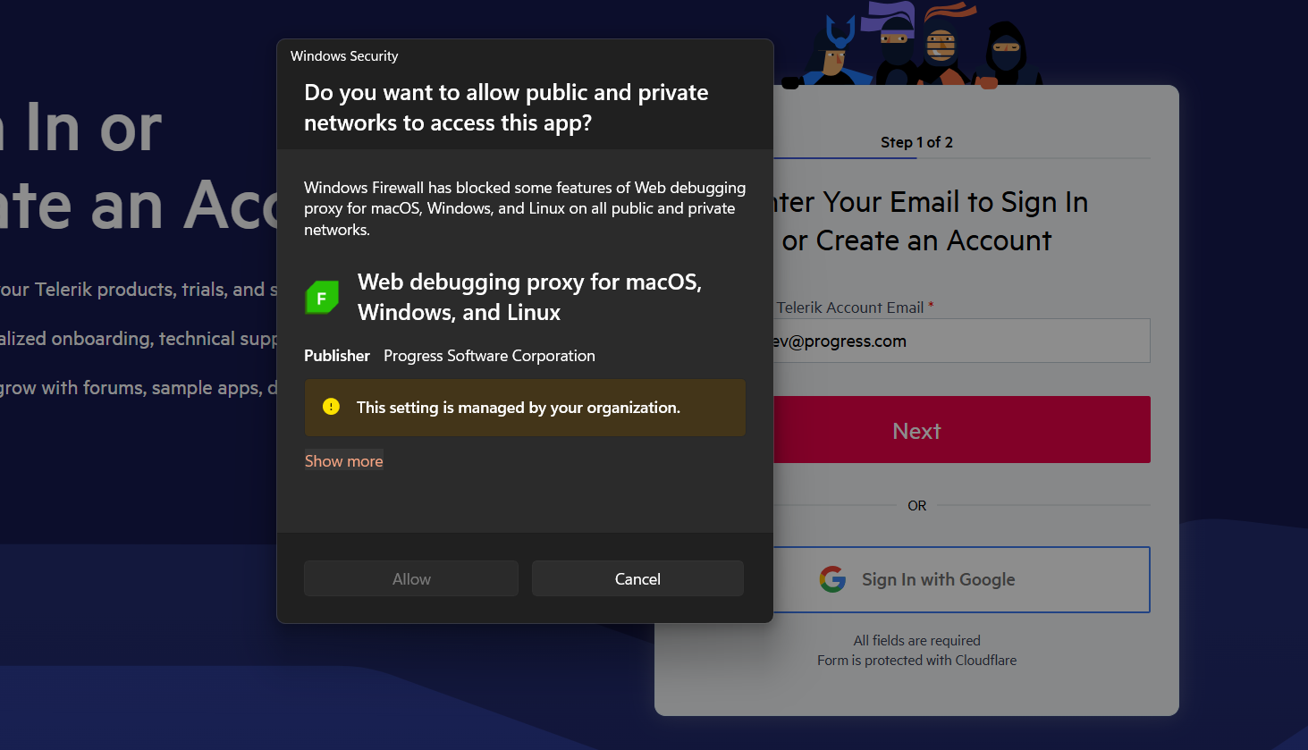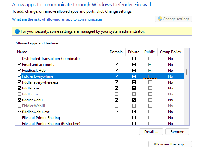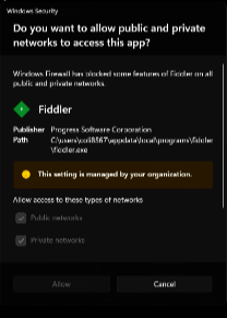"I updated from windows 10 to windows 11...Fiddler Everywhere was working last week when I was using on Windows 10. After upgrading, I tried to use it again today and cannot establish a remote connection to monitor traffic from a mobile device. I noticed when I first opened Fiddler I received a windows firewall notification. The option to "allow" was greyed out and I could only close the prompt. I am assuming the problem with connecting is related to the firewall but these seem to be managed by the organization. Please help allow traffic through Fiddler to assist in my debugging workflows."