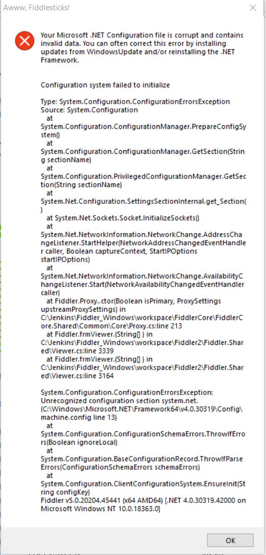 Have you tried the suggestions provided in the error screen (updating Windows and updating/reinstalling the NET framework)? It looks like something has changed your environment, so I would suggest trying the above (also suggested here) and trying to deinstall and reinstall the Fiddler app completely.