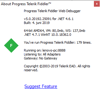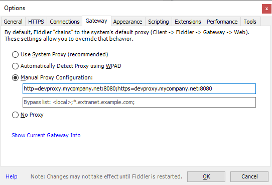 Suddenly my Fiddler installation is no longer able to forward traffic to my upstream system proxy, if I use the Fiddler Gateway setting "Use System Proxy (recommended)". The proxy is manually set up in my Windows 10 Proxy settings to "http://devproxy.mycompany.net" port 8080 and works fine for e.g. requests from Chrome (without Fiddler).