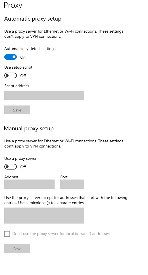 Lastly, I recommend verifying the Proxy Settings are not configured when Fiddler is Running. See the below screenshots for the proxy settings that are not configured.