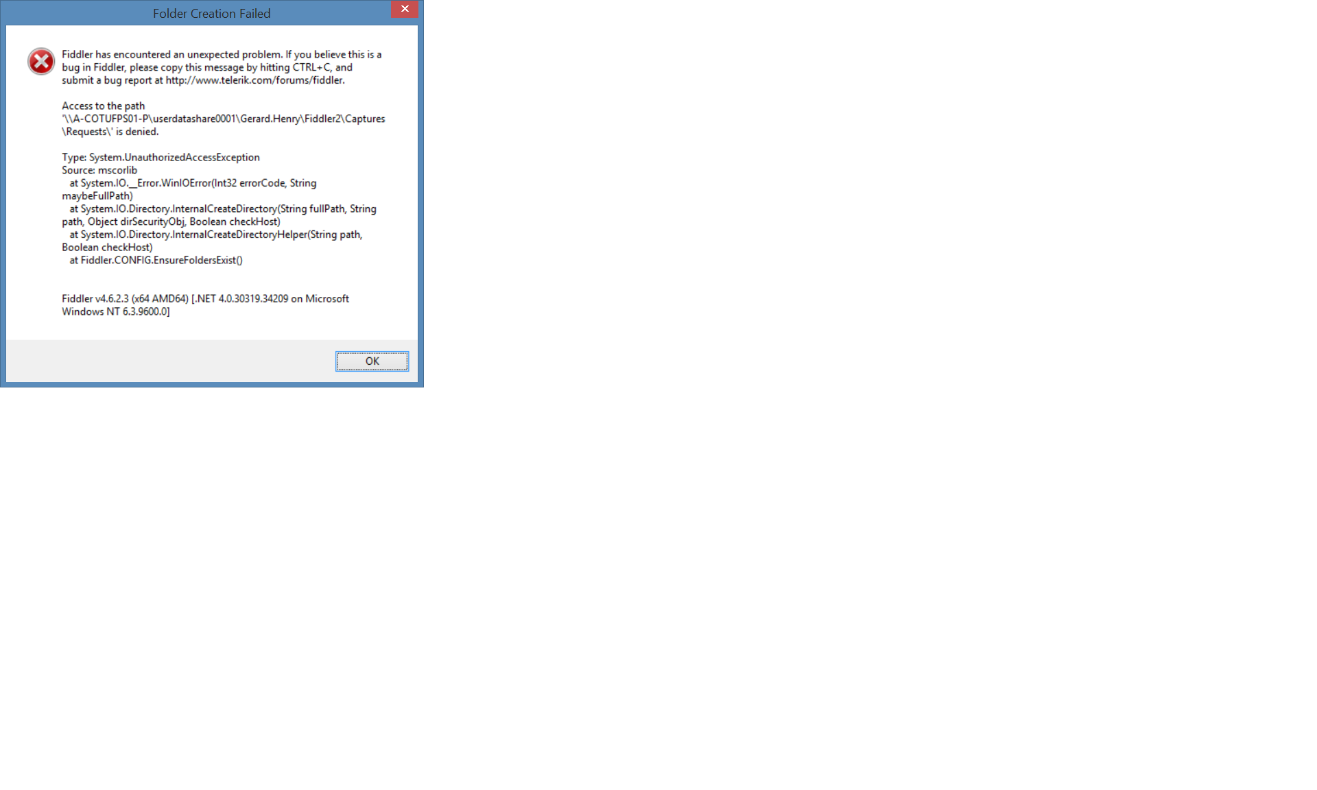 Fiddler has encountered an unexpected problem. If you believe this is a bug in Fiddler, please copy this message by hitting CTRL+C, and submit a bug report at http://www.telerik.com/forums/fiddler.