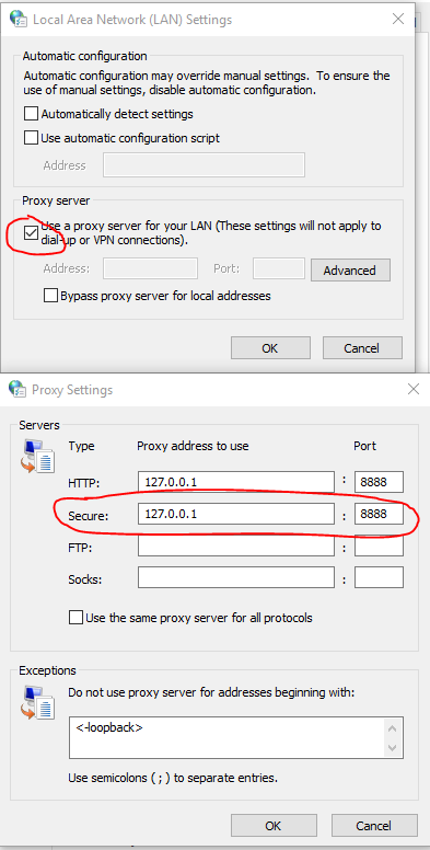 My proxy settings (including Secure) have been set. See the attached image named ProxySettingsAfterFiddlerHasStarted.png.