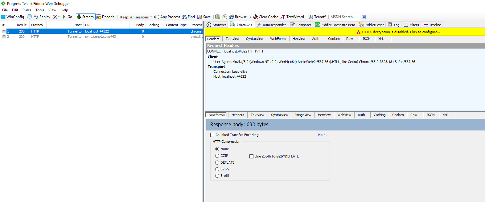 When I turn on decryption I see an additional session labeled as HTTPS that contains my HTTPS request.