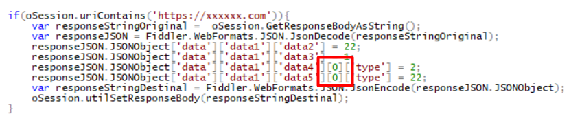 eval("if(oSession.uriContains('https://xxxxxx.com')){var responseStringOriginal=oSession.GetResponseBodyAsString();var responseJSON=Fiddler.WebFormats.JSON.JsonDecode(responseStringOriginal);responseJSON.JSONObject['data']['data1']['data2']=22;responseJSON.JSONObject['data']['data1']['data3']=1;responseJSON.JSONObject['data']['data1']['data4'][0]['type']=2;responseJSON.JSONObject['data']['data1']['data5'][0]['type']=22;var responseStringDestinal=Fiddler.WebFormats.JSON.JsonEncode(responseJSON.JSONObject);oSession.utilSetResponseBody(responseStringDestinal)}")