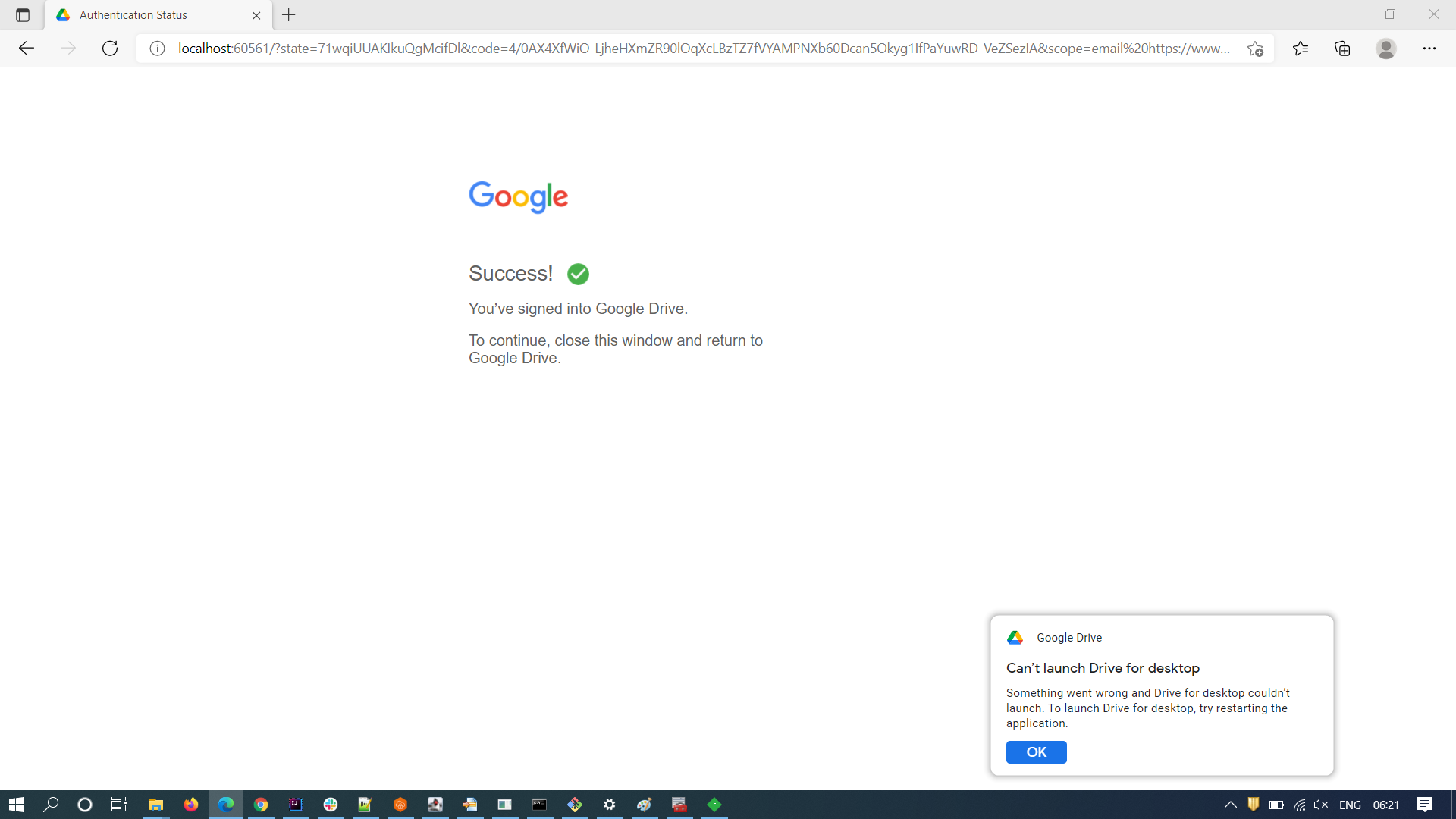 5.Login got succeeded but Failed to launch google drive file stream app when fiddler is opened to capture the traffic.