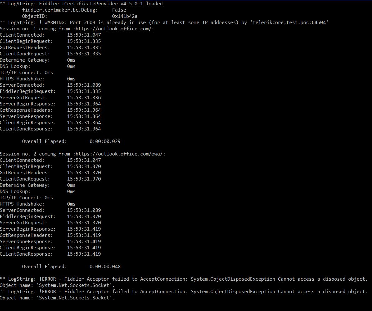 internal class FiddlerProxy : IDisposable{ public string Uri { get; private set; } public Proxy ProxyEndpoint { get; private set; } public int SessionCount { get; private set; } internal FiddlerProxy(string uri) { Uri = uri; ProxyEndpoint = null; SessionCount = 1; } public void Start() { // Register for the FiddlerCore events FiddlerApplication.AfterSessionComplete += OnAfterSessionComplete; FiddlerApplication.BeforeRequest += OnBeforeRequest; FiddlerApplication.OnNotification += delegate (object sender, NotificationEventArgs oNEA) { Console.WriteLine("** NotifyUser: " + oNEA.NotifyString); }; FiddlerApplication.Log.OnLogString += delegate (object sender, LogEventArgs oLEA) { Console.WriteLine("** LogString: " + oLEA.LogString); }; // Create an HTTPs certificate and Start the proxy if (!InstallCertificate()) throw new InvalidOperationException("Creating a certiicate failed. Https traffic cannot be captured."); if (FiddlerApplication.IsStarted()) Stop(); FiddlerApplication.Startup(0, FiddlerCoreStartupFlags.Default & ~FiddlerCoreStartupFlags.RegisterAsSystemProxy); ProxyEndpoint = FiddlerApplication.CreateProxyEndpoint(FiddlerApplication.oProxy.ListenPort, true, "localhost"); } public static bool InstallCertificate() { if (!CertMaker.rootCertExists()) { if (!CertMaker.createRootCert()) return false; if (!CertMaker.trustRootCert()) return false; } return true; } private void OnBeforeRequest(Session session) { if (!ShouldProcess(session)) return; else { // Do something } } private void OnAfterSessionComplete(Session session) { if (!ShouldProcess(session)) return; Console.WriteLine($"Session no. {SessionCount++} coming from :{session.fullUrl}:"); Console.WriteLine(session.Timers.ToString(true)); } private bool ShouldProcess(Session session) { if (session.RequestMethod.Equals("CONNECT", StringComparison.InvariantCultureIgnoreCase)) return false; if (session.fullUrl.Contains(Uri)) return true; else return false; } public void Stop() { if (ProxyEndpoint != null) { ProxyEndpoint.Detach(); ProxyEndpoint.Dispose(); } FiddlerApplication.AfterSessionComplete -= OnAfterSessionComplete; if (FiddlerApplication.IsStarted()) { FiddlerApplication.Shutdown(); } } public void Dispose() { Stop(); }}Then I use FiddlerProxy class in Main() method in Program.cs as follows: