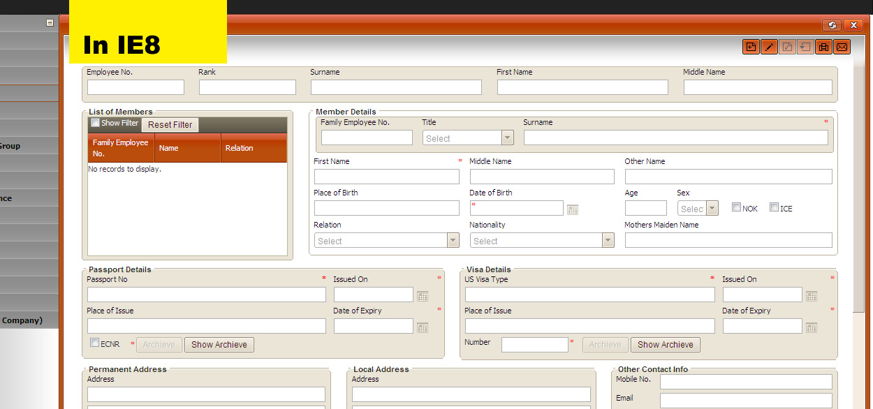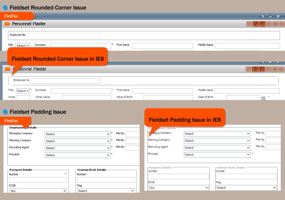 Regarding the FieldSet issue under IE8 - this may result due to the set of a global CSS rule applied to TD/TR tag. I suggest that you set TD/TR rules for the particular table not the whole page.