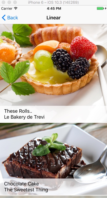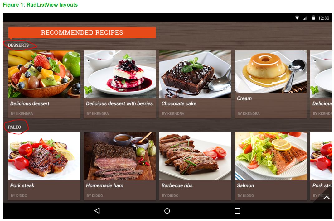 <GridLayout rows="50, *, 50, *" columns=""> <Label row="0" text="First Group" textWrap="true" /> <lv:RadListView row="1" items="{{ dataItems }}" > <lv:RadListView.listViewLayout> <lv:ListViewLinearLayout scrollDirection="Horizontal"/> </lv:RadListView.listViewLayout> <lv:RadListView.itemTemplate> <StackLayout orientation="vertical"> <Label fontSize="20" text="{{ itemName }}"/> <Label fontSize="14" text="{{ itemDescription }}"/> </StackLayout> </lv:RadListView.itemTemplate> </lv:RadListView> <Label row="2" text="Second Group" textWrap="true" /> <lv:RadListView row="3" items="{{ dataItems }}" > <lv:RadListView.listViewLayout> <lv:ListViewLinearLayout scrollDirection="Horizontal"/> </lv:RadListView.listViewLayout> <lv:RadListView.itemTemplate> <StackLayout orientation="vertical"> <Label fontSize="20" text="{{ itemName }}"/> <Label fontSize="14" text="{{ itemDescription }}"/> </StackLayout> </lv:RadListView.itemTemplate> </lv:RadListView></GridLayout>Regards,