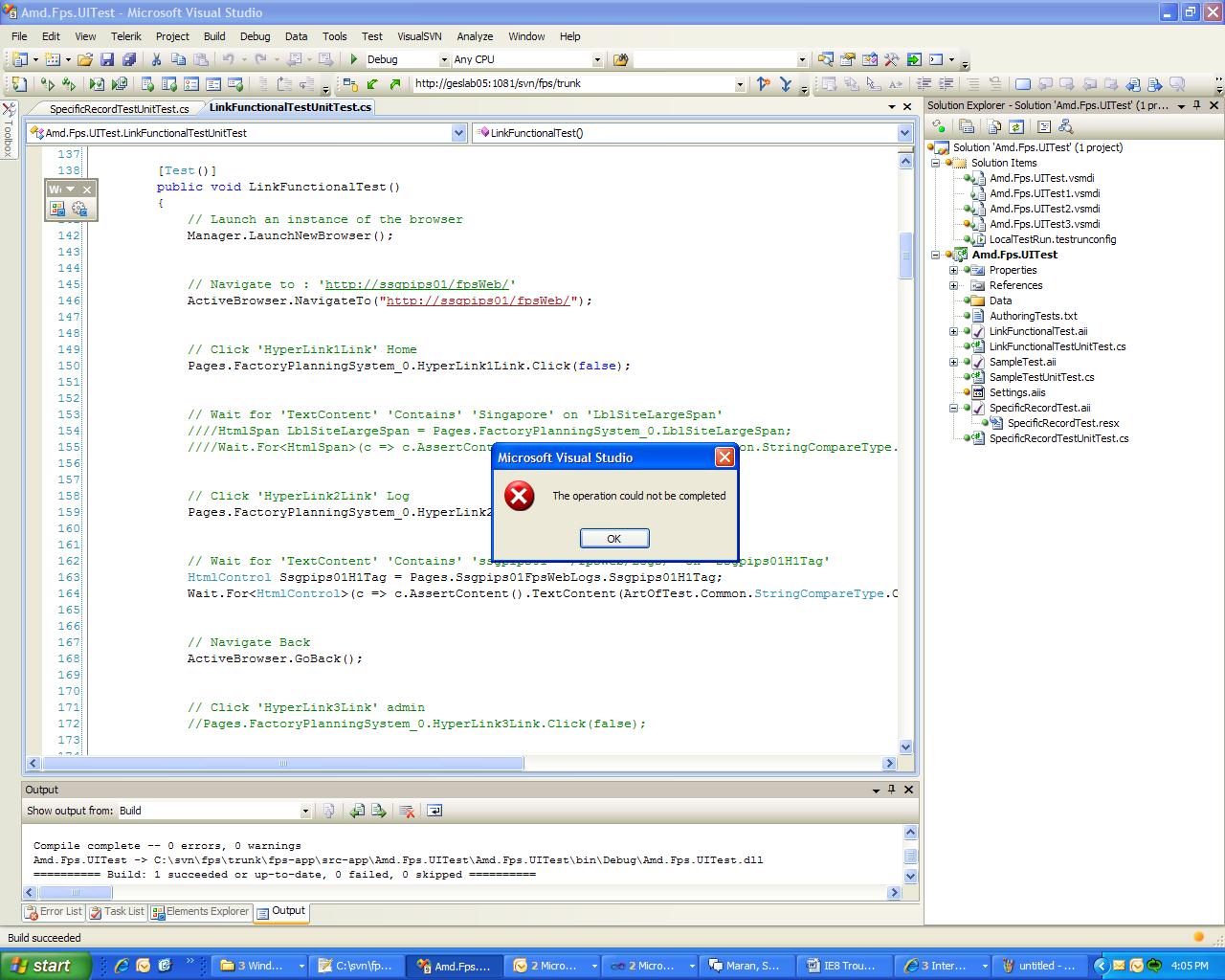 The steps I took to fix the "Operation could not be completed" yesterday when we tried to open that one WebAii test on your computer were: