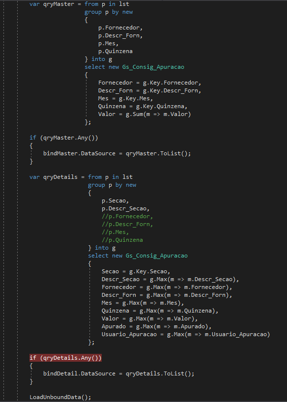 I did a query to list some fields and I grouped in a Linq and attributtes to a BindingSource to show in the main GridView and it worked, but I need fill the GridView Hierarchical with the same query, but without grouping, then I created a new BindingSource and attributes a Linq to he without grouping but not works.