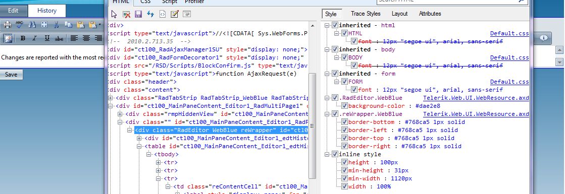 <telerik:RadEditor ID="edtHistory" runat="server" EnableResize="false" ContentAreaMode="Div" EditModes="Preview" Height="100%" NewLineBr="false" Width="100%"> <CssFiles> <telerik:EditorCssFile Value="~/App_Themes/Default/Default.css" /> </CssFiles> <Modules> <telerik:EditorModule Name="RadEditorStatistics" Enabled="false" Visible="false" /> <telerik:EditorModule Name="RadEditorDomInspector" Enabled="false" Visible="false" /> <telerik:EditorModule Name="RadEditorHtmlInspector" Enabled="false" Visible="false" /> <telerik:EditorModule Name="RadEditorNodeInspector" Enabled="false" Visible="false" /> </Modules></telerik:RadEditor>FYI, I'm using Q2 2010.