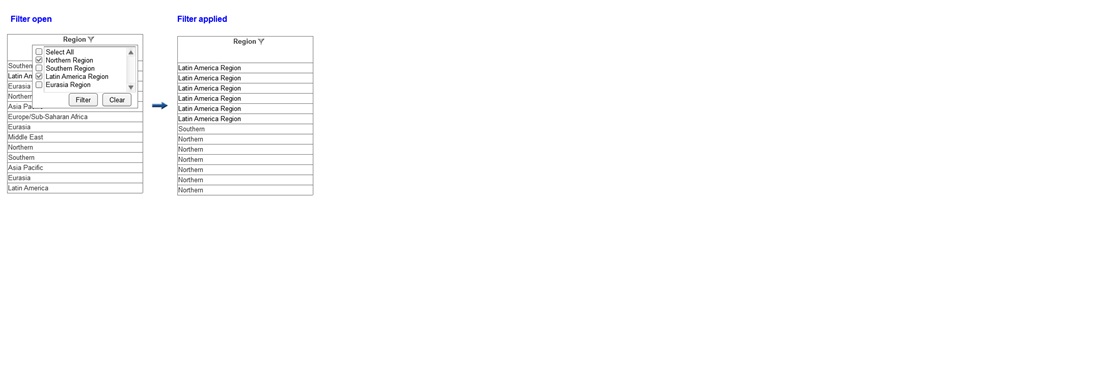 <telerik:RadGrid ID="RadGrid1" runat="server" OnPreRender="RadGrid1_PreRender" AutoGenerateColumns="False" OnNeedDataSource="RadGrid1_NeedDataSource" EnableLinqExpressions="false"> <mastertableview editmode="InPlace" allowfilteringbycolumn="true" commanditemdisplay="Top"> <Columns> <telerik:GridBoundColumn DataField="EmployeeID" HeaderText="EmployeeID" SortExpression="EmployeeID" UniqueName="EmployeeID" DataType="System.Int32"> <FilterTemplate> <telerik:RadComboBox ID="RadComboBox1" runat="server" DataSourceID="SqlDataSource1" DataValueField="EmployeeID" DataTextField="EmployeeID" EmptyMessage="All Types" AllowCustomText="true" Width="240px"> <ItemTemplate> <asp:CheckBox runat="server" Checked="true" ID="chk1" onclick="onCheckBoxClick(this)" /> <%# Eval("EmployeeID")%> </ItemTemplate> <FooterTemplate> <asp:Button ID="clrFilters" runat="server" Text="Clear filters" OnClick="clrFilters_Click" /> </FooterTemplate> </telerik:RadComboBox> <telerik:RadScriptBlock ID="RadScriptBlock1" runat="server"> <script type="text/javascript"> function onCheckBoxClick(chk) { var text = "", values = ""; var tableView = $find("<%# ((GridItem)Container).OwnerTableView.ClientID %>"); var combo = $find('<%# ((GridItem)Container).FindControl("RadComboBox1").ClientID %>'); //get the collection of all items var items = combo.get_items(); //enumerate all items for (var i = 0; i < items.get_count(); i++) { var item = items.getItem(i); //get the checkbox element of the current item var chk1 = $get(combo.get_id() + "_i" + i + "_chk1"); if (chk1.checked) { text += item.get_text() + ","; values += item.get_value() + ","; } } //remove the last comma from the string text = removeLastComma(text); values = removeLastComma(values); $find("<%= RadAjaxManager1.ClientID %>").ajaxRequest("EmployeeID," + text); } function removeLastComma(str) { return str.replace(/,$/, ""); } </script> </telerik:RadScriptBlock> </FilterTemplate> </telerik:GridBoundColumn> <telerik:GridBoundColumn DataField="City" HeaderText="City" SortExpression="City" UniqueName="City"> </telerik:GridBoundColumn> </Columns> </mastertableview> <clientsettings> <Selecting AllowRowSelect="true" /> </clientsettings></telerik:RadGrid><br /><asp:Button ID="clrFilters" runat="server" Text="Clear filters" OnClick="clrFilters_Click" /><asp:SqlDataSource ID="SqlDataSource1" runat="server" ConnectionString="<%$ ConnectionStrings:NorthwindConnectionString %>" SelectCommand="SELECT * FROM [Employees]"></asp:SqlDataSource><telerik:RadAjaxManager ID="RadAjaxManager1" runat="server" DefaultLoadingPanelID="RadAjaxLoadingPanel1" OnAjaxRequest="RadAjaxManager1_AjaxRequest"> <ajaxsettings> <telerik:AjaxSetting AjaxControlID="RadAjaxManager1"> <UpdatedControls> <telerik:AjaxUpdatedControl ControlID="RadGrid1" /> </UpdatedControls> </telerik:AjaxSetting> <telerik:AjaxSetting AjaxControlID="clrFilters"> <UpdatedControls> <telerik:AjaxUpdatedControl ControlID="RadGrid1" /> </UpdatedControls> </telerik:AjaxSetting> </ajaxsettings></telerik:RadAjaxManager><telerik:RadAjaxLoadingPanel ID="RadAjaxLoadingPanel1" runat="server" Skin="Default" />C#: