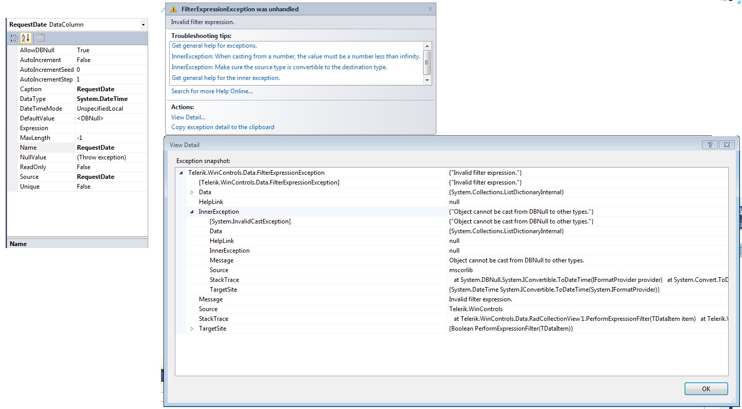 I'm trying to filter a RadGridView against a standard Dataset tableadapter with a SQL server DateTime field.
