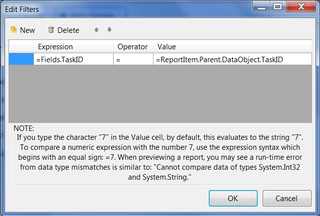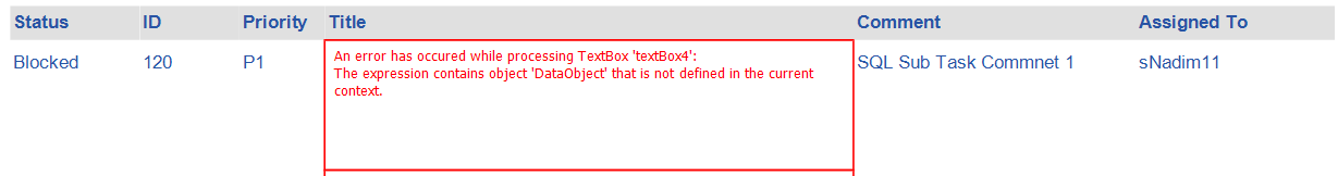 Any way, In order to check what is the value that "ReportItem.Parent.DataObject.TaskID" returns, I sat one of the table columns with as "=ReportItem.Parent.DataObject.TaskID" (Find attached iscreen-shot Report_DataObject.png) and checked the results (Find attached iscreen-shot Report_DataObject_ErrorResult.png).