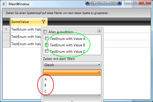 public object Convert(object value, Type targetType, object parameter, System.Globalization.CultureInfo culture) { var test = (TestEnum)value; switch (test) { case TestEnum.A: return "TestEnum with Value A"; case TestEnum.B: return "TestEnum with Value B"; case TestEnum.C: return "TestEnum with Value C"; } throw new NotImplementedException(); }The grid is rendered correctly ("TestEnum with Value A"), but all drop downs located in the extended filter are using the raw values ("A", "B", "C") of our enum and not the transformed values for our converter.