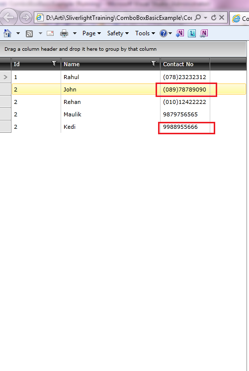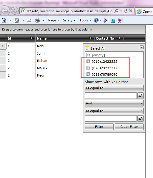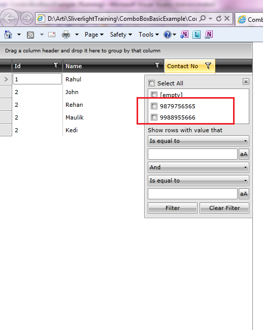 In GridView, I have added one GridViewDataColumn (Contact No.) with two different properties, either Mobile Number or LandLine Number.Whatever is exists , will display in column. Its working fine (I am using Visibility Converter to display either Mob No or LandLine No).But filter is not working properly because at a time it we can bind only property to DataBindingMember.