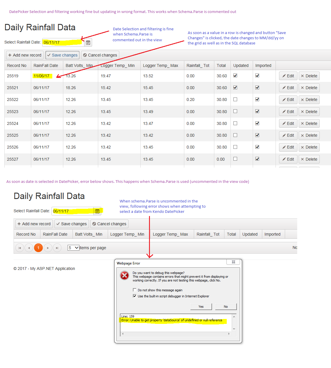 This means for example 6th Day of November 2017 (06/11/17) now shows as 11th Day of June 2017 (11/06/17) in the SQL database after I click on update. All I need is to have Kendo Grid Update function to be able to update or insert correctly so I can continue on with completing my application. I really like Kendo UI for MVC but if I don’t get this working, I might look at using other MVC frameworks to develop my application.