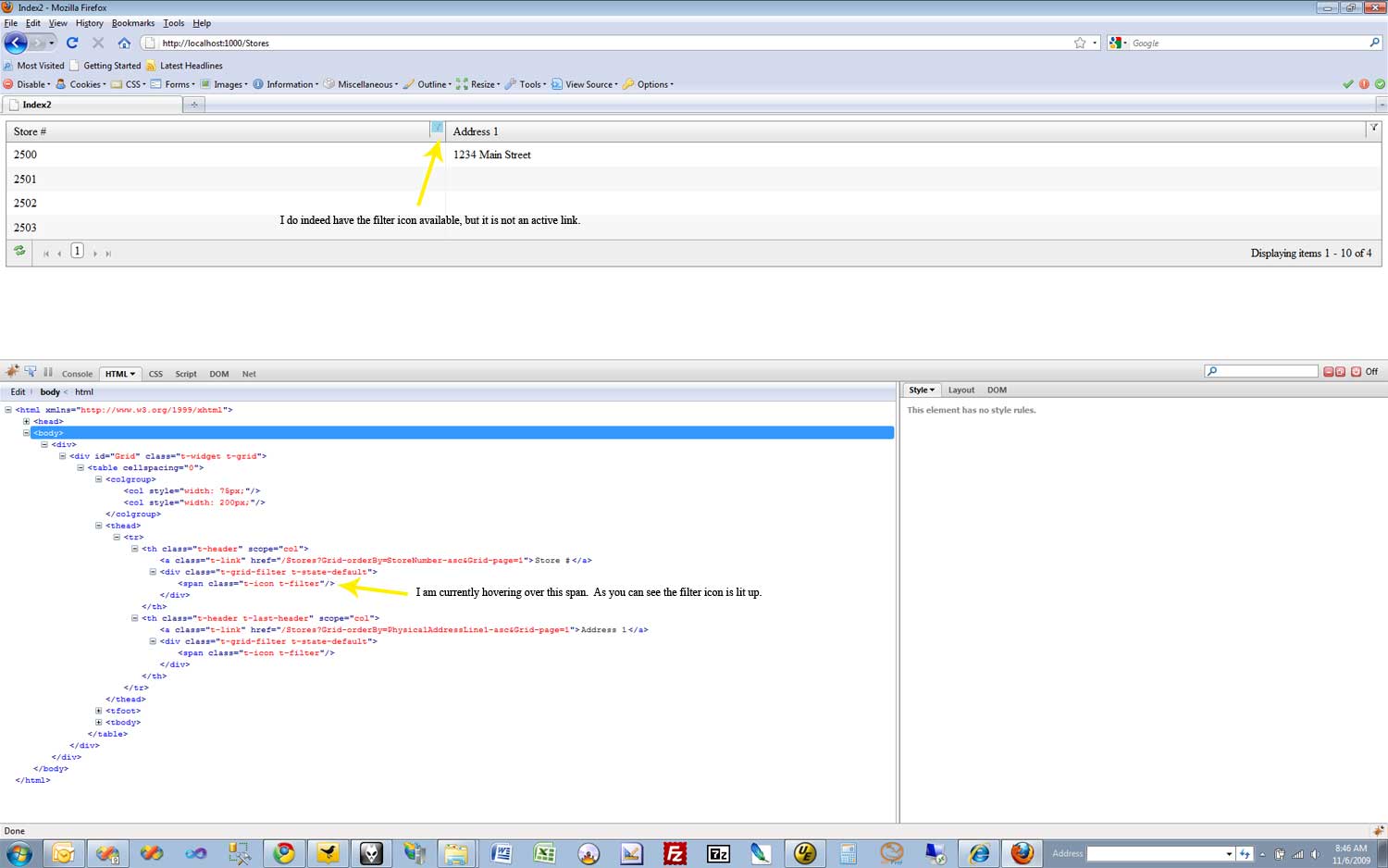Thank you for the reply. I have removed all other css and script dependencies and I get the same result. In FireBug all four script files load properly as you will see in the attached screenshots. The filter icon shows up, but is not an active link. I have tried both the minimized javascript files and the non-minimized from the Telerik Examples Scripts folder. The store object being passed in has its properties set with the proper data types, int and string respectively.