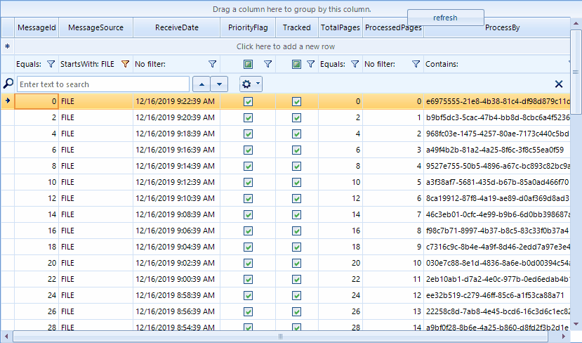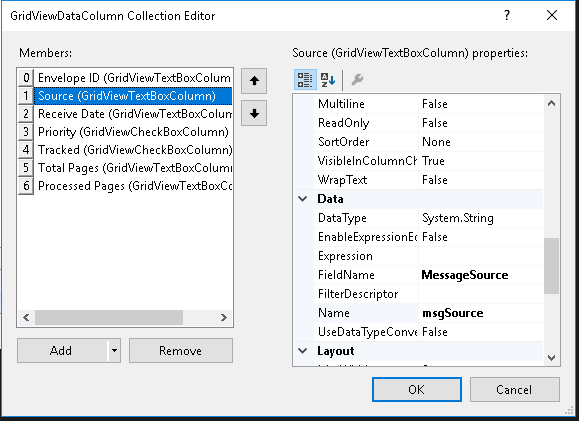 public class MessageSort{ public int MessageId { get; set; } public string MessageSource { get; set; } public DateTime? ReceiveDate { get; set; } public bool PriorityFlag { get; set; } public bool? Tracked { get; set; } public int TotalPages { get; set; } public int? ProcessedPages { get; set; } public string ProcessBy { get; set; }}Hello, Jay,