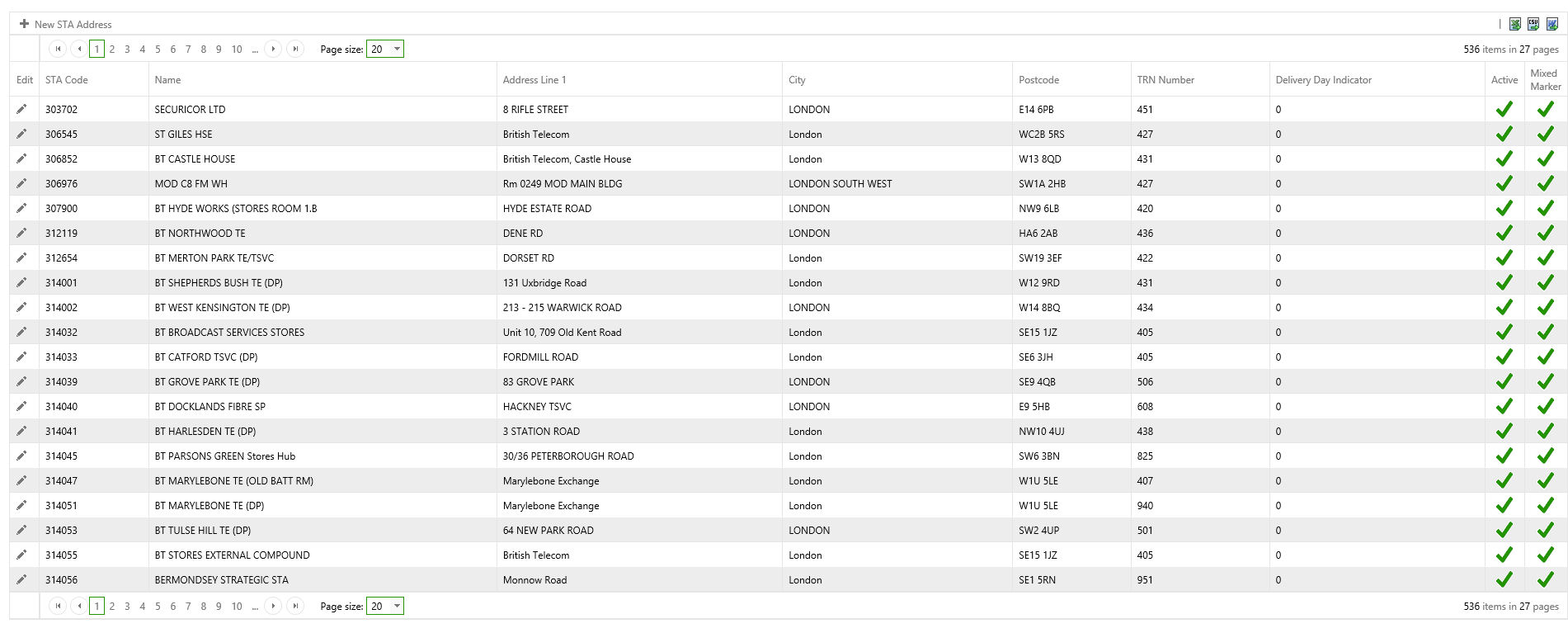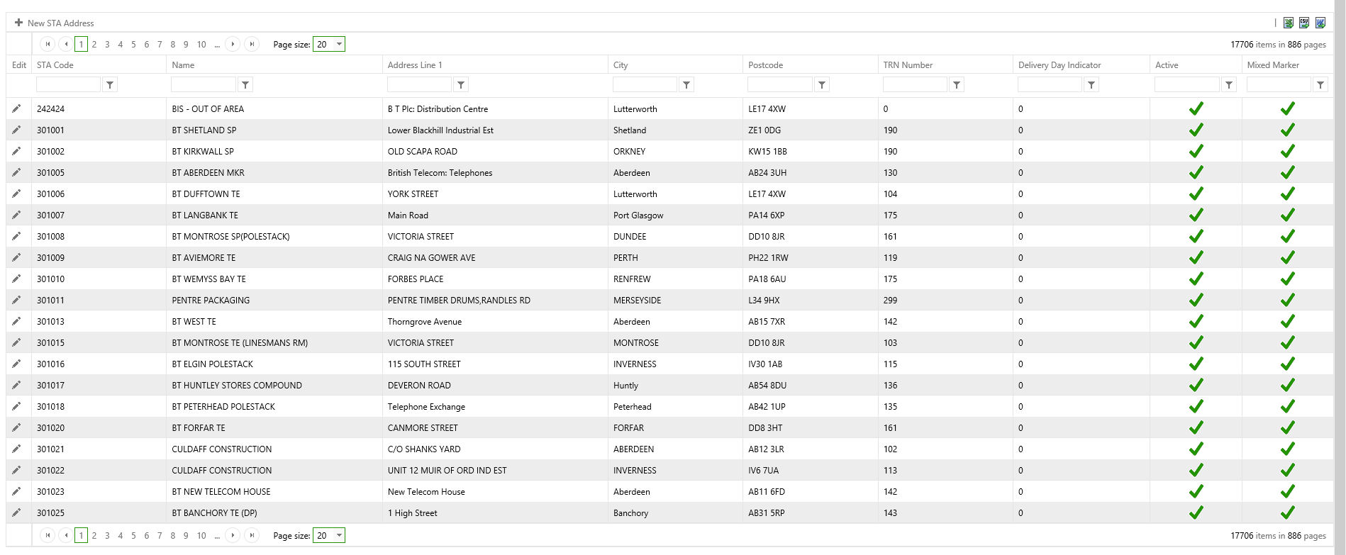 <telerik:RadGrid runat="server" ID="rgdAddresses" AutoGenerateColumns="false" ShowStatusBar="true" AllowSorting="True" AllowFilteringByColumn="true" OnItemCommand="rgdAddresses_ItemCommand" OnNeedDataSource="rgdAddresses_NeedDataSource" OnInit="rgdAddresses_Init" OnItemDataBound="rgdAddresses_ItemDataBound" OnSortCommand="rgdAddresses_SortCommand"> <MasterTableView DataKeyNames="Id, STACode" CommandItemDisplay="Top"> <CommandItemSettings ShowExportToWordButton="true" ShowExportToExcelButton="true" ShowExportToCsvButton="true" ShowExportToPdfButton="false" ShowRefreshButton="false" ShowAddNewRecordButton="true" AddNewRecordText="New STA Address" /> <Columns> <telerik:GridEditCommandColumn ButtonType="ImageButton" ItemStyle-Width="20px" HeaderText="Edit" UniqueName="Edit" /> <telerik:GridBoundColumn UniqueName="STACode" HeaderText="STA Code" DataField="STACode" AllowFiltering="true" /> <telerik:GridBoundColumn UniqueName="Name" HeaderText="Name" DataField="Name" AllowFiltering="true" /> <telerik:GridBoundColumn UniqueName="AddressLine1" HeaderText="Address Line 1" DataField="AddressLine1" AllowFiltering="true" /> <telerik:GridBoundColumn UniqueName="AddressLine2" HeaderText="Address Line 2" DataField="AddressLine2" Visible="false" /> <telerik:GridBoundColumn UniqueName="AddressLine3" HeaderText="Address Line 3" DataField="AddressLine3" Visible="false" /> <telerik:GridBoundColumn UniqueName="AddressLine4" HeaderText="Address Line 4" DataField="AddressLine4" Visible="false" /> <telerik:GridBoundColumn UniqueName="City" HeaderText="City" DataField="City" AllowFiltering="true" /> <telerik:GridBoundColumn UniqueName="Postcode" HeaderText="Postcode" DataField="Postcode" AllowFiltering="true" /> <telerik:GridBoundColumn UniqueName="CountryCode" HeaderText="Country Code" DataField="CountryCode" Visible="false" /> <telerik:GridBoundColumn UniqueName="TRNNumber" HeaderText="TRN Number" DataField="TRNNumber" AllowFiltering="true" /> <telerik:GridBoundColumn UniqueName="DepotNumber" HeaderText="Depot Number" DataField="DepotNumber" Visible="false" /> <telerik:GridBoundColumn UniqueName="DeliveryDayIndicator" HeaderText="Delivery Day Indicator" DataField="DeliveryDayIndicator" /> <telerik:GridTemplateColumn HeaderText="Active" UniqueName="Active" HeaderStyle-Width="30px" ItemStyle-HorizontalAlign="Center"> <ItemTemplate> <asp:Image ID="imgActive" runat="server" ImageUrl="<%# GetBindingActiveImage() %>" /> </ItemTemplate> </telerik:GridTemplateColumn> <telerik:GridBoundColumn UniqueName="ActiveExport" HeaderText="Active" DataField="Active" Visible="false" /> <telerik:GridTemplateColumn HeaderText="Mixed Marker" UniqueName="MixedMarker" HeaderStyle-Width="30px" ItemStyle-HorizontalAlign="Center"> <ItemTemplate> <asp:Image ID="imgMixedMarker" runat="server" ImageUrl="<%# GetBindingMixedMarkerImage() %>" /> </ItemTemplate> </telerik:GridTemplateColumn> <telerik:GridBoundColumn UniqueName="MixedMarkerExport" HeaderText="Mixed Marker" DataField="MixedMarker" Visible="false" /> </Columns> <EditFormSettings EditFormType="Template"> <FormTemplate> <table class="tableStyle"> <tr> <td colspan="5"> <asp:Label ID="lblInstruction" runat="server" CssClass="subTitle" Text='<%# (Container is GridEditFormInsertItem) ? "Add a new STA Address" : "Edit existing STA Address" %>' /> </td> </tr> <tr> <td style="width: 100px"> <asp:Label ID="lblSTACode" runat="server" CssClass="labelStyle" Text="STA Code:" /> </td> <td> <asp:TextBox ID="txtSTACode" runat="server" CssClass="textBoxStyle" Text='<%# Bind("STACode") %>' MaxLength="30" TabIndex="1"/> </td> <td style="width: 30px"></td> <td style="width: 120px"> <asp:Label ID="lblActive" runat="server" CssClass="labelStyle" Text="Active:" /> </td> <td> <asp:CheckBox ID="chkActive" runat="server" Checked='<%# (Container is GridEditFormInsertItem) ? true : Eval("Active") %>' TabIndex="9" /> </td> </tr> <tr> <td> <asp:Label ID="lblName" runat="server" CssClass="labelStyle" Text="Name:" /> </td> <td> <asp:TextBox ID="txtName" runat="server" CssClass="textBoxStyle" Text='<%# Bind("Name") %>' MaxLength="50" TabIndex="2" /> </td> <td></td> <td> <asp:Label ID="lblTRNNumber" runat="server" CssClass="labelStyle" Text="TRN Number:" /> </td> <td> <asp:TextBox ID="txtTRNNumber" runat="server" CssClass="textBoxStyle" Text='<%# Bind("TRNNumber") %>' MaxLength="6" TabIndex="10" /> </td> </tr> <tr> <td> <asp:Label ID="lblAddressLine1" runat="server" CssClass="labelStyle" Text="Address Line 1:" /> </td> <td> <asp:TextBox ID="txtAddressLine1" runat="server" CssClass="textBoxStyle" Text='<%# Bind("AddressLine1") %>' MaxLength="50" TabIndex="2" /> </td> <td></td> <td> <asp:Label ID="lblDepotNumber" runat="server" CssClass="labelStyle" Text="Depot Number:" /> </td> <td> <asp:TextBox ID="txtDepotNumber" runat="server" CssClass="textBoxStyle" Text='<%# Bind("DepotNumber") %>' MaxLength="5" TabIndex="11"/> </td> </tr> <tr> <td> <asp:Label ID="lblAddressLine2" runat="server" CssClass="labelStyle" Text="Address Line 2:" /> </td> <td> <asp:TextBox ID="txtAddressLine2" runat="server" CssClass="textBoxStyle" Text='<%# Bind("AddressLine2") %>' MaxLength="30" TabIndex="3" /> </td> <td></td> <td> <asp:Label ID="lblMixedMarker" runat="server" CssClass="labelStyle" Text="Mixed Marker:" /> </td> <td> <asp:Label ID="lblMixedMarkerValue" runat="server" CssClass="labelStyle" Text='<%# (Container is GridEditFormInsertItem) ? "True" : Eval("MixedMarker") %>' /> </td> </tr> <tr> <td> <asp:Label ID="lblAddressLine3" runat="server" CssClass="labelStyle" Text="Address Line 3:" /> </td> <td> <asp:TextBox ID="txtAddressLine3" runat="server" CssClass="textBoxStyle" Text='<%# Bind("AddressLine3") %>' MaxLength="30" TabIndex="4"/> </td> <td></td> <td> <asp:Label ID="lblDeliveryDay" runat="server" CssClass="labelStyle" Text="Delivery Day Indicator:" /> </td> <td> <asp:Label ID="lblDeliveryDayValue" runat="server" CssClass="labelStyle" Text='<%# (Container is GridEditFormInsertItem) ? "0" : Eval("DeliveryDayIndicator") %>' /> </td> <
