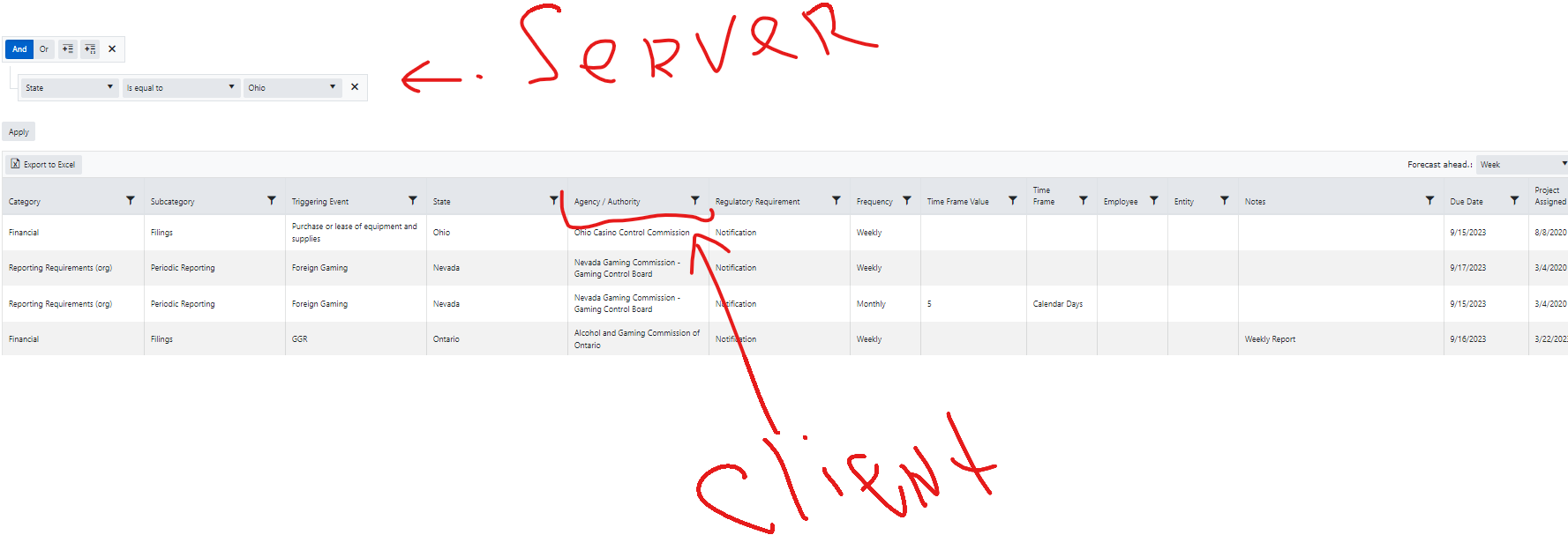 the scenario - I want to have the filter be above the grid & be able to apply the filtering on the server to limit the result set, but at the same time, when the result set is limited give the user the ability to filter the grid on the client using grid row filter