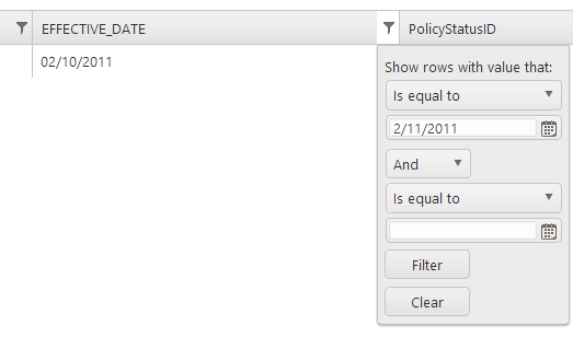 One perplexing thing is that if I add the following, it filters by the top parameter, and the grid actually looks like it wants to filter by date. If I click on the filter next to "EFFECTIVE DATE" is actually HAS the correct date and operator all filled in. Clicking on "filter" then makes it filter perfectly. So why won't it just filter it to begin with like every other type of field?