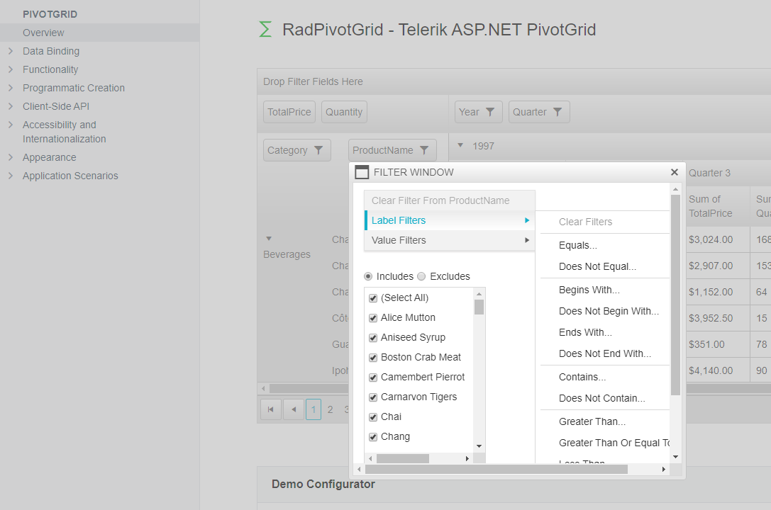 <telerik:RadPivotGrid ID="reportPivotGrid" runat="server" OnNeedDataSource="reportPivotGrid_OnNeedDataSource" AllowSorting="True" Overlay="True" EnableToolTips="True" Skin="Windows7" ColumnHeaderZoneText="" DataHeaderZoneText="" ShowFilterHeaderZone="False" FilterWindow-Width="600" FilterWindow-Height="550" UseQueryableDataProvider="True"> <ClientSettings EnableFieldsDragDrop="false" Scrolling-SaveScrollPosition="True" /> <PagerStyle ChangePageSizeButtonToolTip="Change Page Size" PageSizeControlType="RadComboBox"></PagerStyle> <RowHeaderCellStyle Width="200px" /> <Fields> <telerik:PivotGridRowField DataField="Rep" ZoneIndex="1" Caption="Rep" SortOrder="Ascending"> </telerik:PivotGridRowField> <telerik:PivotGridColumnField DataField="Year" SortOrder="Descending" Caption="Year"> </telerik:PivotGridColumnField> <telerik:PivotGridColumnField DataField="Month" Caption="Month" SortOrder="Descending" > </telerik:PivotGridColumnField> <telerik:PivotGridAggregateField DataField="Sale" Aggregate="Sum" DataFormatString="{0:C}" Caption="Sales"> <TotalFormat Level="0" Axis="Rows" TotalFunction="NoCalculation" SortOrder="Ascending"></TotalFormat> </telerik:PivotGridAggregateField> </Fields> </telerik:RadPivotGrid>I tried to replicate the described issue in a test application using your PivotGrid settings but to no avail. Find attached my test page and see what the difference in your case is.