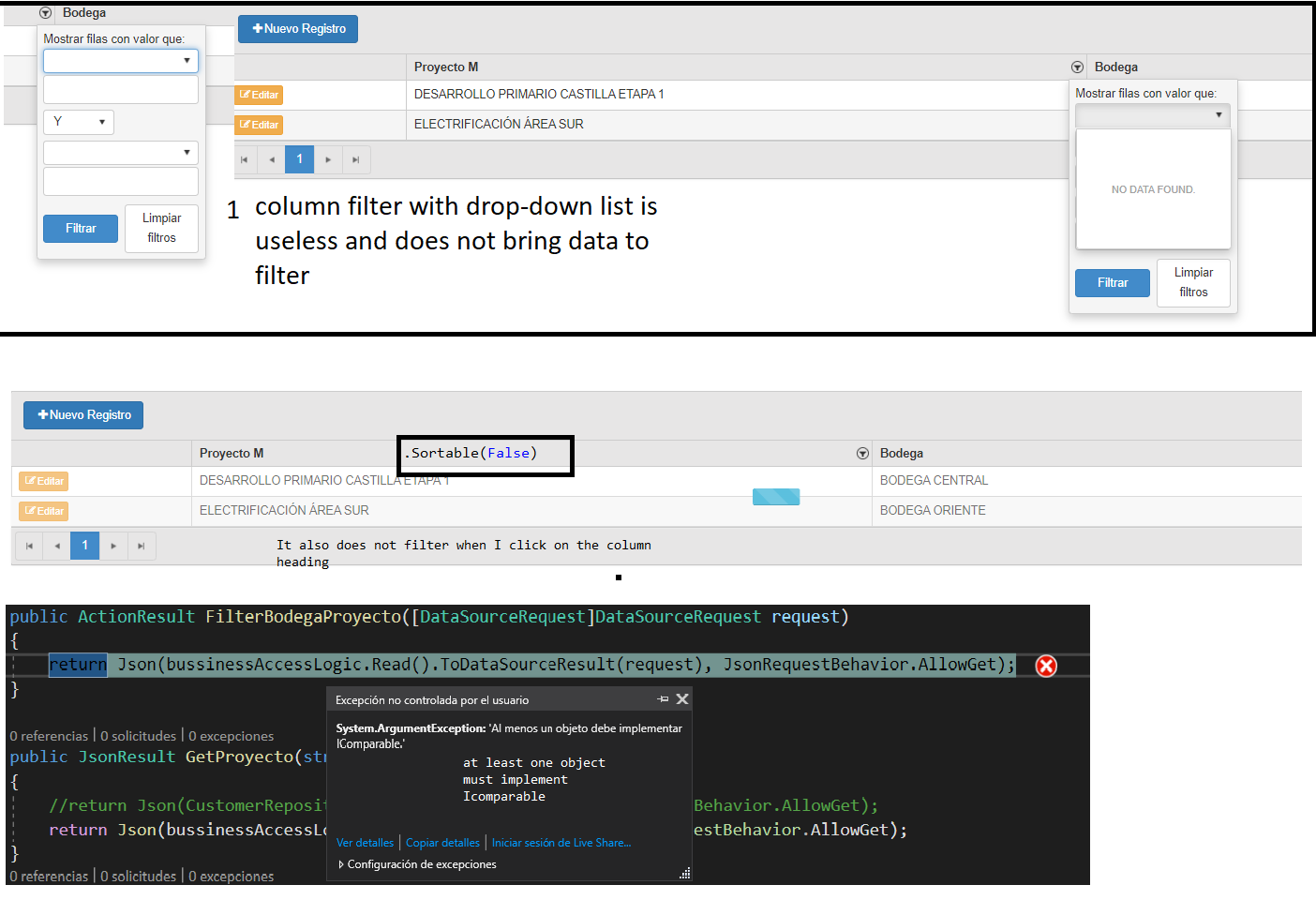 my problem is that the column filter doesn't work