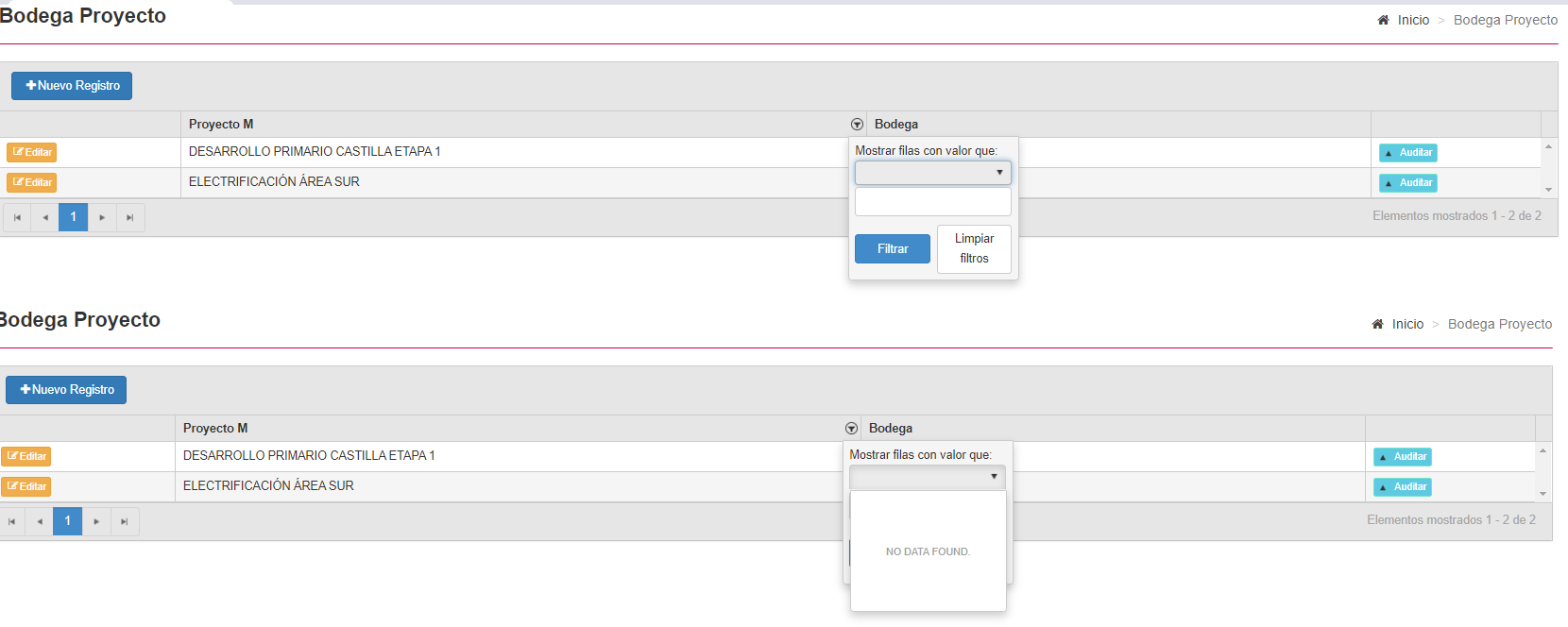 everything works fine except the column filters where I use the drop down list