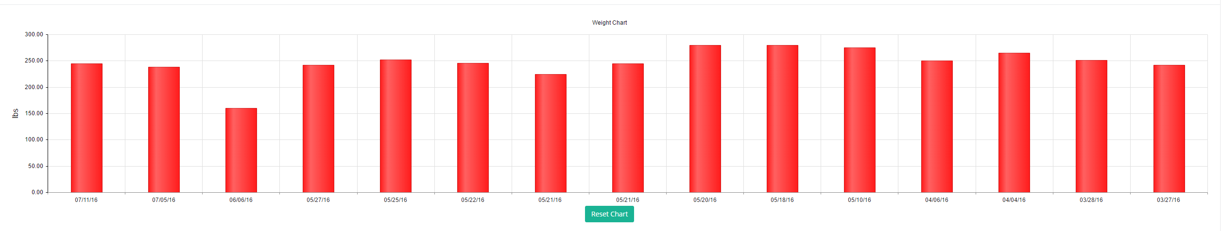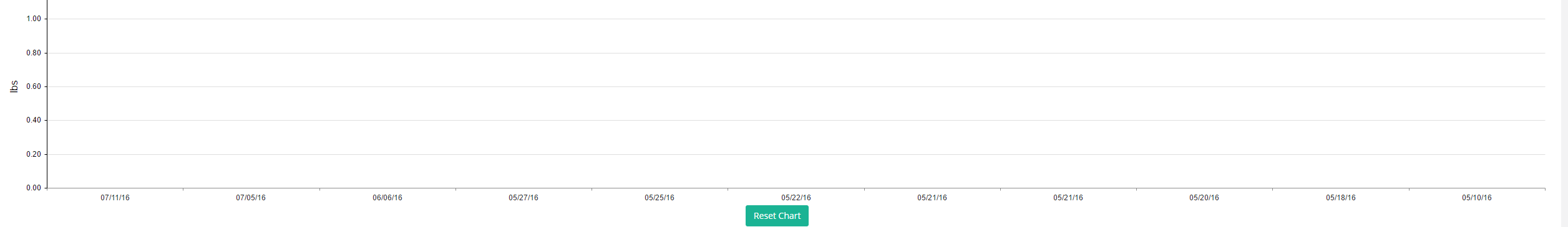 this.chartConfiguration = { title: "Weight Chart", renderAs: "canvas", series: [ { data: dataPoints.map(dp => dp.value), field: "value", type: 'column', color: "#ff1c1c", axis: "weight", markers: { visible: false } } ], pannable: true, zoomable: false, valueAxis: [ { name: "weight", color: "#000000", title: { text: "lbs" }, labels: { format: "n" } } ], tooltip: { visible: true, format: '{0}', template: '${value} lbs' }, categoryAxis: { categories: dataPoints.map(dp => moment(dp.date).format("MM/DD/YY")), max: 15, labels: { rotation: "auto" } } };}InitialWeightChartData.png is how the chart looks like after initial page load