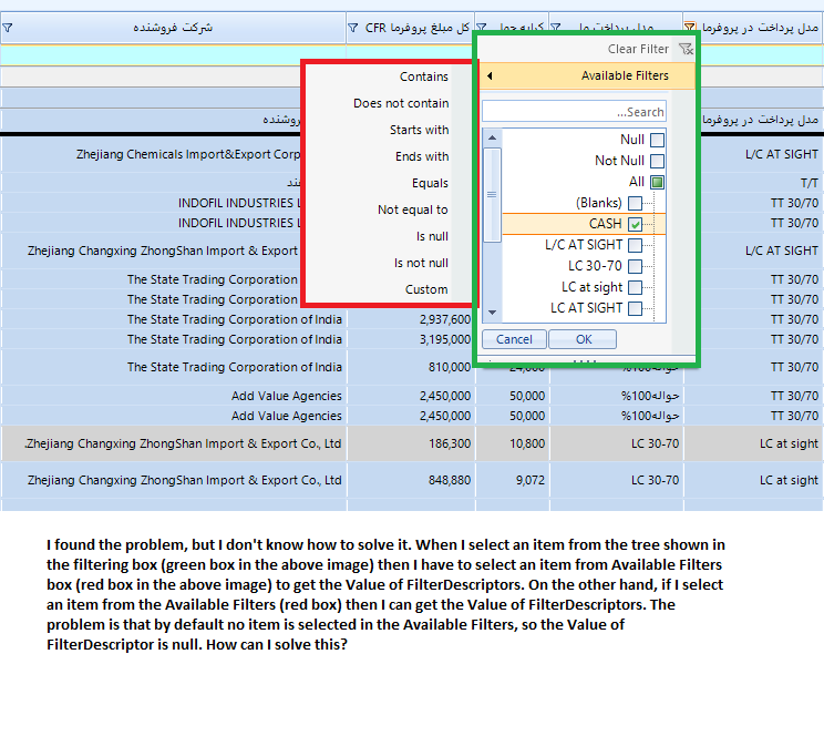 2) Why does the grid.FilterDescriptors.First(.....).Value return null? The PropertyName and Operand is OK, but Value is null.