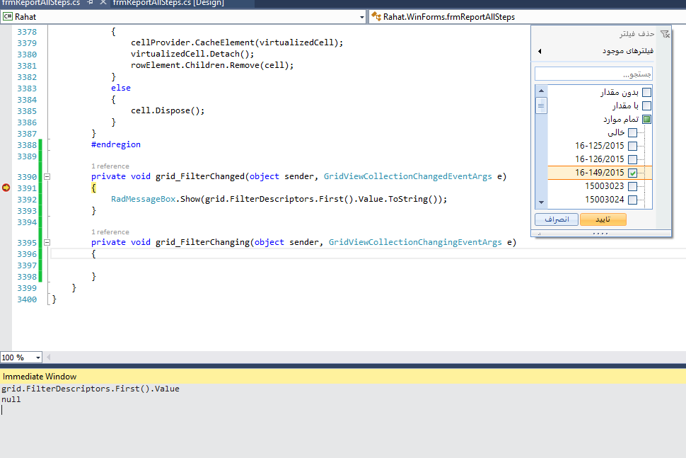 private void radButton1_Click(object sender, EventArgs e){ FilterDescriptor desc = new FilterDescriptor("Name", FilterOperator.Contains, "Sam"); radGridView1.Columns["Name"].FilterDescriptor = desc; var value = radGridView1.FilterDescriptors.First().Value; Console.WriteLine(value);}2. The Value property represents the currently used filter value. In your case, it may not be set. You can test this with the above code.