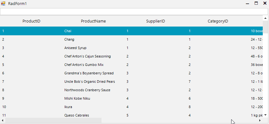 Private Sub radTxtSearch_KeyDown(sender As Object, e As KeyEventArgs) Handles radTxtSearch.KeyDown If e.KeyCode = Keys.Enter Then radLstDetails.EnableFiltering = True Dim typeFilter As New FilterDescriptor("Column 4", FilterOperator.Contains, radTxtSearch.Text) radLstDetails.FilterDescriptors.Add(typeFilter) radLstDetails.ListViewElement.DataView.Refresh() End If End SubHello, Arun,