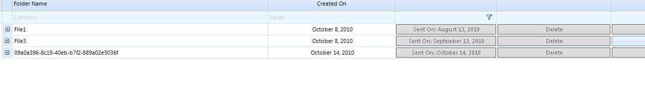using System;using System.Collections.Generic;using System.Windows.Forms;using Telerik.WinControls;using Telerik.WinControls.Data;using Telerik.WinControls.UI;public partial class Form1 : Form{ private RadGridView radGridView1; public Form1() { InitializeComponent(); Controls.Add(radGridView1 = new RadGridView()); radGridView1.CellFormatting += new CellFormattingEventHandler(radGridView1_CellFormatting); radGridView1.DataBindingComplete += new GridViewBindingCompleteEventHandler(radGridView1_DataBindingComplete); radGridView1.EditorRequired += new EditorRequiredEventHandler(radGridView1_EditorRequired); radGridView1.CellBeginEdit += new GridViewCellCancelEventHandler(radGridView1_CellBeginEdit); } protected override void OnLoad(EventArgs e) { base.OnLoad(e); radGridView1.ReadOnly = true; radGridView1.AutoSizeColumnsMode = GridViewAutoSizeColumnsMode.Fill; radGridView1.Dock = DockStyle.Fill; radGridView1.DataSource = new TestsCollection(10); radGridView1.EnableFiltering = true; } void radGridView1_ContextMenuOpening(object sender, ContextMenuOpeningEventArgs e) { RadDropDownMenu dtMenu = new RadDropDownMenu(); var itemSelected = false; //No Filter var noFilterMenuItem = new RadMenuItem(); noFilterMenuItem.Text = "No Filter"; noFilterMenuItem.Click += new EventHandler(NoFilter_MenuItem_Click); dtMenu.Items.Add(noFilterMenuItem); //Separator var separator = new RadMenuSeparatorItem(); dtMenu.Items.Add(separator); var menuItem = new RadMenuItem(); menuItem.Click += new EventHandler(SentFilter_MenuItem_Click); menuItem.Text = "Sent"; menuItem.IsChecked = IsFilterActive("Command", "Sent"); dtMenu.Items.Add(menuItem); itemSelected = !itemSelected ? menuItem.IsChecked : itemSelected; menuItem = new RadMenuItem(); menuItem.Text = "Not Sent"; menuItem.IsChecked = IsFilterActive("Command", "Not Sent"); menuItem.Click += new EventHandler(NotSentFilter_MenuItem_Click); itemSelected = !itemSelected ? menuItem.IsChecked : itemSelected; dtMenu.Items.Add(menuItem); noFilterMenuItem.IsChecked = !itemSelected; e.ContextMenu = dtMenu; radGridView1.ContextMenuOpening -= radGridView1_ContextMenuOpening; } private bool IsFilterActive(string propertyName, string filterString) { foreach (var filter in radGridView1.FilterDescriptors) { if (filter.PropertyName == propertyName && filter.Value == filterString) { return true; } } return false; } void NotSentFilter_MenuItem_Click(object sender, EventArgs e) { var filterFound = false; for (int i = radGridView1.FilterDescriptors.Count - 1; i >= 0; i--) { var filter = radGridView1.FilterDescriptors[i]; if (filter.PropertyName == "Command") { filter.Operator = Telerik.WinControls.Data.FilterOperator.StartsWith; filter.Value = "Not Sent"; filterFound = true; break; } } if (!filterFound) { radGridView1.FilterDescriptors.Add(new FilterDescriptor("Command", FilterOperator.StartsWith, "Not Sent")); } } void SentFilter_MenuItem_Click(object sender, EventArgs e) { var filterFound = false; for (int i = radGridView1.FilterDescriptors.Count - 1; i >= 0; i--) { var filter = radGridView1.FilterDescriptors[i]; if (filter.PropertyName == "Command") { filter.Operator = Telerik.WinControls.Data.FilterOperator.StartsWith; filter.Value = "Sent"; filterFound = true; break; } } if (!filterFound) { radGridView1.FilterDescriptors.Add(new FilterDescriptor("Command", FilterOperator.StartsWith, "Sent")); } } void NoFilter_MenuItem_Click(object sender, EventArgs e) { for (int i = radGridView1.FilterDescriptors.Count - 1; i >= 0; i--) { var filter = radGridView1.FilterDescriptors[i]; if (filter.PropertyName == "Command") { radGridView1.FilterDescriptors.RemoveAt(i); break; } } } void radGridView1_CellBeginEdit(object sender, GridViewCellCancelEventArgs e) { if (radGridView1.Columns[e.ColumnIndex].Name != "Command") { return; } // because you are using a custom context menu you don't have to show the dropdown anymore e.Cancel = true; //var editor = radGridView1.ActiveEditor as RadDropDownListEditor; //var dropDownElement = editor.EditorElement as RadDropDownListEditorElement; //dropDownElement.DataSource = new object[] { "Sent", "Not Sent" }; } void radGridView1_EditorRequired(object sender, EditorRequiredEventArgs e) { var editManager = sender as GridViewEditManager; if (editManager == null || radGridView1.CurrentColumn.Name != "Command") { return; } e.Editor = new RadDropDownListEditor(); e.EditorType = typeof(RadDropDownListEditor); } void radGridView1_DataBindingComplete(object sender, GridViewBindingCompleteEventArgs e) { var column = new CustomCommandColumn("Command"); column.FieldName = "Command"; column.CustomDataOperation = CustomDataOperation.Filtering; this.radGridView1.Columns.Add(column); } void radGridView1_CellFormatting(object sender, CellFormattingEventArgs e) { if (e.CellElement.ColumnInfo.Name == "Command" && e.CellElement as GridFilterCellElement != null) { var gridFilterElement = e.CellElement as GridFilterCellElement; var filterButtonElement = gridFilterElement.Children[0] as GridFilterButtonElement; filterButtonElement.MouseDown -= new MouseEventHandler(filterButtonElement_MouseDown); filterButtonElement.MouseDown += new MouseEventHandler(filterButtonElement_MouseDown); } var commandCell = e.CellElement as GridCommandCellElement; if (commandCell != null) { var test = e.CellElement.RowInfo.DataBoundItem as Test; if (test.Id % 2 == 0) { commandCell.Text = "Sent on " + e.CellElement.RowIndex + DateTime.Now.AddDays(-1 * e.CellElement.RowIndex); commandCell.Value = "Sent on " + e.CellElement.RowIndex + DateTime.Now.AddDays(-1 * e.CellElement.RowIndex); commandCell.CommandButton.AutoSizeMode = RadAutoSizeMode.FitToAvailableSize; commandCell.CommandButton.TextElement.AutoSize = true; commandCell.CommandButton.Text = "Sent on " + e.CellElement.RowIndex + DateTime.Now.AddDays(-1 * e.CellElement.RowIndex); } else { commandCell.Value = "Not Sent"; commandCell.Text = "Not Sent"; commandCell.CommandButton.Text = "Not Sent"; } } } void filterButtonElement_MouseDown(object sender, MouseEvent