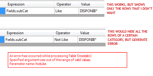 I've tried to use a Filtering expression for the crosstab, but if apply an expression on the main category field, obviously the WHOLE group gets hidden/displayed, not just the totals row of that group. (NOTE: using the operator Not Like generates an error when previewing, while the same filter with Like operator works. Is it correct ? - see attachment 2)