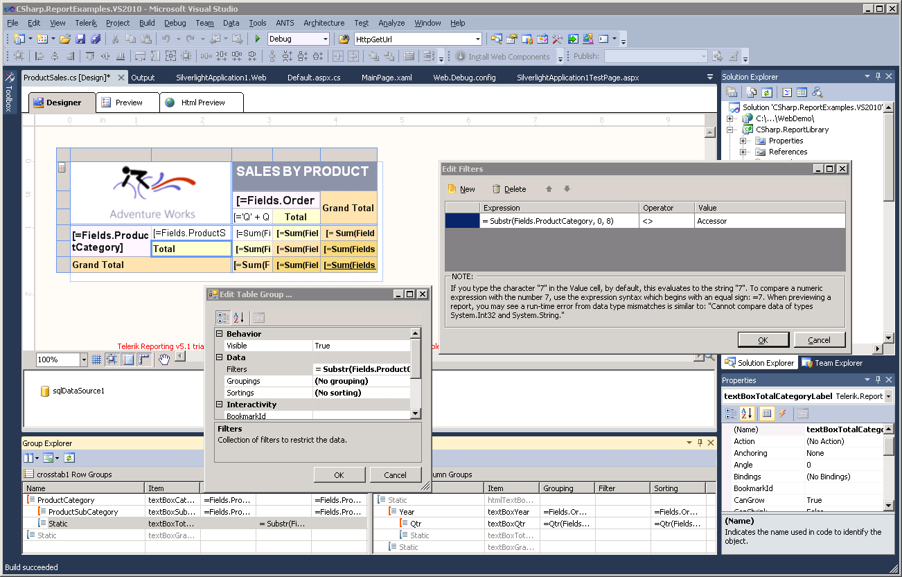 Private Sub Crosstab1_ItemDataBound(ByVal sender As Object, ByVal e As System.EventArgs) Handles Crosstab1.ItemDataBound Dim table As Telerik.Reporting.Processing.Table = DirectCast(sender, Telerik.Reporting.Processing.Table) For Each row As Telerik.Reporting.Processing.TableRow In table.Rows If row.Index = 3 Then For colIndex As Integer = 0 To table.Columns.Count - 1 Dim cell As Telerik.Reporting.Processing.ITableCell = row.GetCell(colIndex) If cell.RowIndex = row.Index AndAlso cell.ColumnIndex = colIndex Then Dim item As Telerik.Reporting.Processing.ReportItem = cell.Item If TypeOf (item) Is Processing.TextBox Then Dim txt As Processing.TextBox = DirectCast(item, Processing.TextBox) item.Visible = False 'does not work txt.Visible = False 'does not work txt.Height = New Telerik.Reporting.Drawing.Unit(0) 'does not work txt.Style.Color = Color.Red 'it works ! End If Else ' Do nothing. This is part of a merged table cell End If Next End If NextEnd SubI've tried to use a Filtering expression for the crosstab, but if apply an expression on the main category field, obviously the WHOLE group gets hidden/displayed, not just the totals row of that group. (NOTE: using the operator Not Like generates an error when previewing, while the same filter with Like operator works. Is it correct ? - see attachment 2)