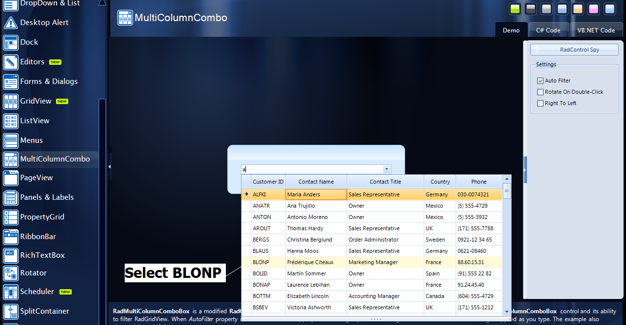 In namespace Telerik.Examples.WinControls.Editors.ComboBox.MultiColumnComboBox i customize Onload Method.