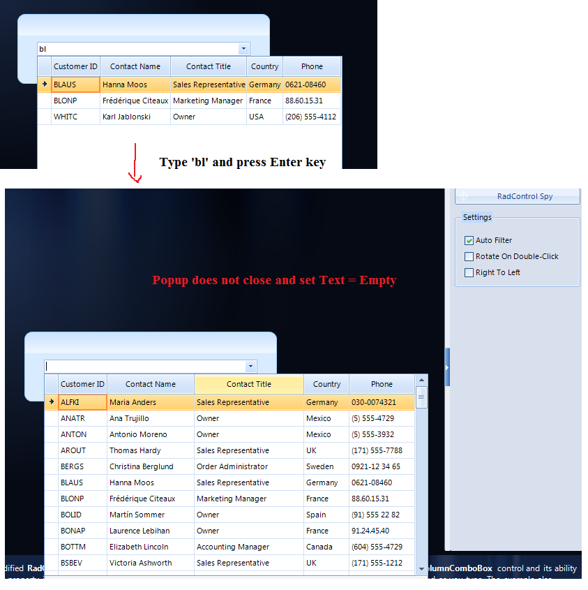 I set property AutoFilter = true and FilterDescriptors i set it filter on multicolumn with FilterOperator.Contains . When key press it auto filter then i select one row in EditorControl but SelectedValue set a wrong value.