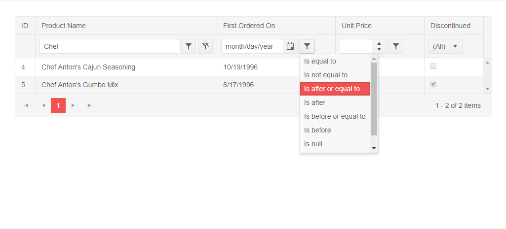 Indeed, using this approach we will not be able to benefit from the provided built in filter templates, like the kendo-grid-date-filter-menu, which in turn can use a number of provided operators. Rather, we will need to create the logic for creating the required CompositeFitlerDescriptor passed to the filter method of the filterService on our own.