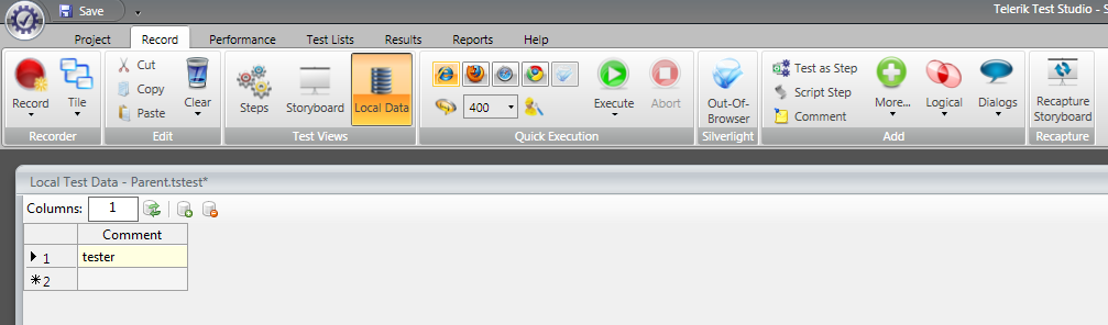 The Parent test is data driven. The local data table has a "Comment" column. It contains the CreateContact and DeleteContact tests as Test as Steps.