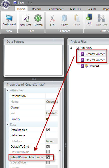 - The project tab. Highlight each child test and enable its InheritParentDataSource property.